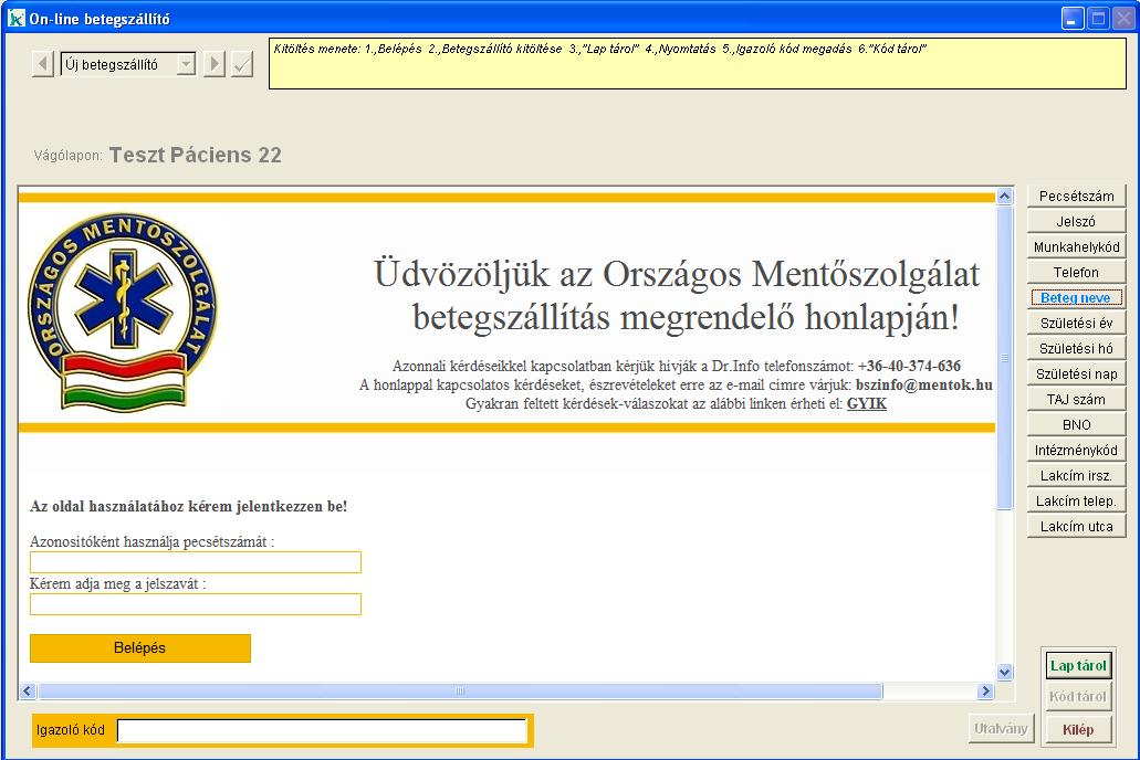 A menüpont segítségével ugyanaz a felület érhető el, ami böngészőben is az OMSZ honlapján. A mentőszállítási űlap kitöltéséhez a jobb oldali gombsor segítségével rögzíthetők az adatok.