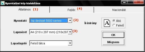 Dokumentumaink nyomtatására vonatkozó általános beállításokat végezhetjük el ebben a menüpontban. Az általános lapon (1) beállítható, hogy a nyomtatások általában melyik nyomtatón kerüljenek kinyomtatásra (2). A lapméret választása (3) lehet A5-ös, vagy A4-es. |