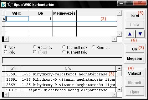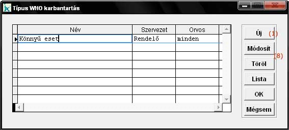 Tetszőleges név alatt elmenthető, különböző betegségekre jellemző WHO kód listákat készíthetünk ebben a menüpontban. Így amikor a WHO kód rögzítésre kerül a sor (pl. a napi ellátás során) nem kell minden egyes kódot külön-külön kijelölni, elég csak az itt megadott nevet, s ennek hatására az előre meghatározott kódlista egyből kiválasztásra kerül (lásd az általános részben!) Új WHO csoportot az "új" nyomógombbal (1) hozhatunk létre. |