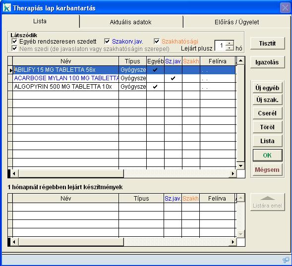 A fekete pipa az adott oszlopban mutatja a csoportba tartozást. A szürke pipa utal arra, hogy az adott készítmény az adott csoportban már lejárt. Az 1 hónapnál régebben lejárt készítmények a felső listában nem jelennek meg, ugyanez igaz a receptírásnál a Th.lap szerinti válogatásra is. Éppen ezért a Th.lap karbantartásban lehetőségünk van az 1 hónapnál régebben lejárt készítményeket az alsó válogató listából a Th.listára helyezni (Listára emel nyomógomb), mint egyéb rendszeresen szedett készítményt. Beállíthatjuk azt is, hogy ne az 1 hónapnál régebbi készítményeket tegye az alsó listába, hanem akár 24 hónapot is kérhetünk. Ide új készítményt, a táblázat mellett látható 'Új egyéb' nyomógombra kattintva vehetünk fel. Ekkor csak az egyéb listára fog felkerülni az adott gyógyszer. Amennyiben új szakorvosi javaslatot szeretnénk rögzíteni, azt az 'Új szak.' nyomógobra kattintva tudjuk megtenni. Ekkor megnyílik a szakorvosi javaslatok karbantartása menüpont. A készítmény kiválasztása után lehetőség van valamennyi páciens therápiás lapján a készítmény cseréjére a 'Cserél' gomb segítségével. Ha az új választott készítmény akár az érvényes szakorvosi javaslatok, akár - a már nem használatos, de használható - érvényes szakhatósági vélemények között ott van, akkor nem cseréli. Szintén nem hajtódik végre a csere azon therápiás lapokon, ahol a régi vagy az új készítmény már 'Nem szedi'-ként szerepel.
