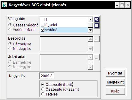 A kimutatás minden negyedév végén készül, és az adott negyedévben hatodik hónapjukat betöltött gyermekek BCG - oltási adatait tartalmazza. Kérhető összesítő és tételes jelentés is. |