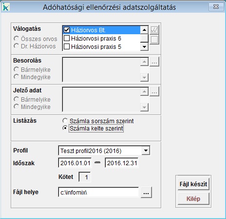 Profil mezőbe betöltődnek annak a praxisnak a számlaprofiljai, melyik