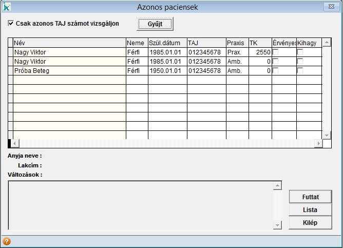 függően - TAJ azonosító alapján gyűjti ki az azonos pacienseket. Az érvényes pacienst az "érvényes" oszlopban kell megjelölni. Ehhez a megjelölt pacienshez lesz áttéve a többi azonos nevű, "érvénytelen" paciens forgalmi adata (személyi adatok kivételével). Ha olyan azonos nevű pacienseket is hoz a lista, akik csak a nevük alapján azonosak, de érvényesek, és nem kell az adataikat átmásolni sehova, akkor ezeket a pacienseket a "kihagy" oszlopban kell megjelölni. Csak akkor kell megjelölni a kihagyandó pacienseket, ha meg van jelölve egy "érvényes" is. Az azonos nevű paciensek közül csak egyet lehet megjelölni "érvényesnek". Az "érvénytelen" paciensek távoztatott státuszt kapnak "Téves felvétel" címen. Ha a "Csak