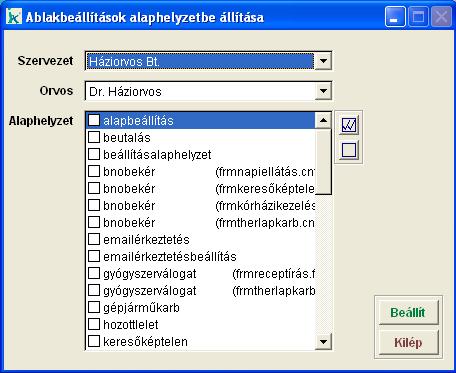 A kiválasztott ablakok helyzetét és méretét, valamint a fogaskerékkel beállítható funkcióit állíthatjuk ezen menüpont segítségével alaphelyzeti értékekre, amennyiben rendszergazdai szerepkörrel vagyunk a programba bejelentkezve. |