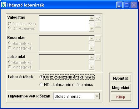 Leválogatja a program mindazokat a praxisbeli pácienseket, akiknek a Figyelembe vett időszakban (vagy egyáltalán) nincs megfelelő labor értéke (Össz. koleszterin, vagy HDL koleszterin) rögzítve.