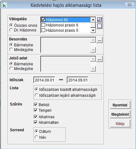 Kedvtelési hajós alkalmassági menüpontban a megadott 'Időszak'-ra vonatkozóan a rögzített alkalmassági vizsgálatokat tudjuk itt kilistáztatni a programmal. A 'Válogatás' mezőben ki tudjuk választani, hogy mely szervezetre készüljön el a lista.