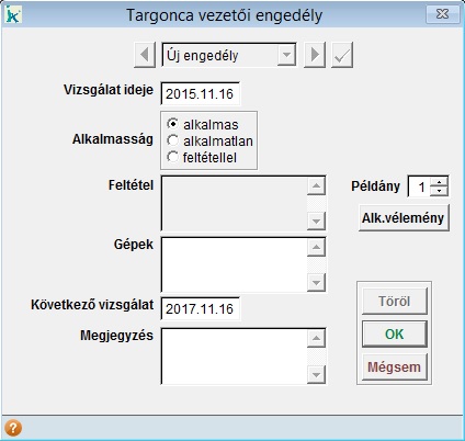 Az Alk.vélemény gombot megnyomva tudunk a megadott példányszámban targonca vezetői alkalmassági véleményt nyomtatni.