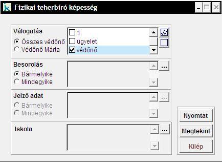 Azon betegek névsorát készíti el a program akiknek az iskolai törzslapon ki van töltve a fiz.teherb.képesség nevű mező. A listázó nemek, életkor és a teherbírás képessége szerint is csoportosít, elkészíthető iskolák szerinti bontásban is. |