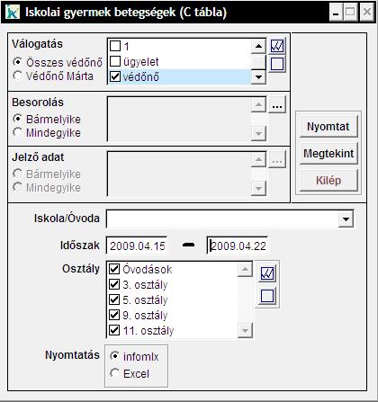 A lenyíló menüből válasszuk ki az Iskolát/Óvodát. Adjuk meg az indőintervallumot és azt az osztályt vagy osztályokat, melyeket szeretnénk szerepeltetni a táblázatban.