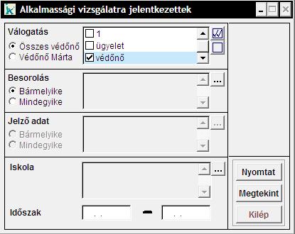 Iskola alkalmassági vizsgálatokat a Iskolai alkalmassági vizsgálat menüpontban lehet. A 'Válogatás' keretben figyeljünk a bejelölt mezőre, ha több orvos is dolgozik a programmal.