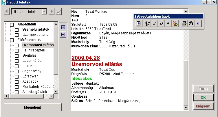 gombra kattintva megjelenik a lelet nyomtatási képe, ami tetszés szerint