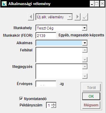 Lehetőség van már eltárolt alkalmassági vélemény törlésére is, ekkor válasszuk ki a megfelelő véleményt, majd nyomjuk meg 'Töröl' gombot (még a pipa gomb megnyomása előtt).