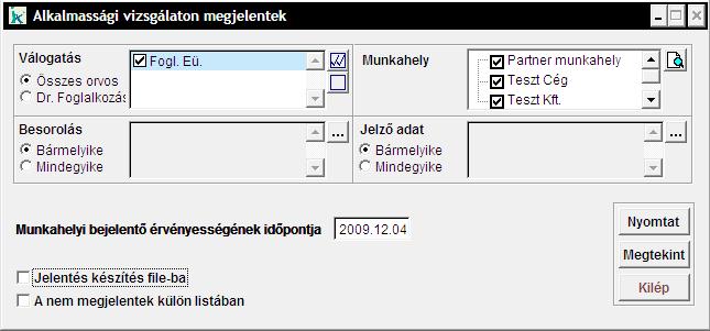 Munkahelyi bejelentő érvényességének időpontja: csak azokat a pacienseket listázza ki a program, akiknek az itt megadott időpontban érvényes munkahelyi bejelentővel rendelkeznek. Kérhető, hogy azokat a pacienseket is kilistáza a program egy külön lapon, akik a vizsgálaton nem jelentek meg.