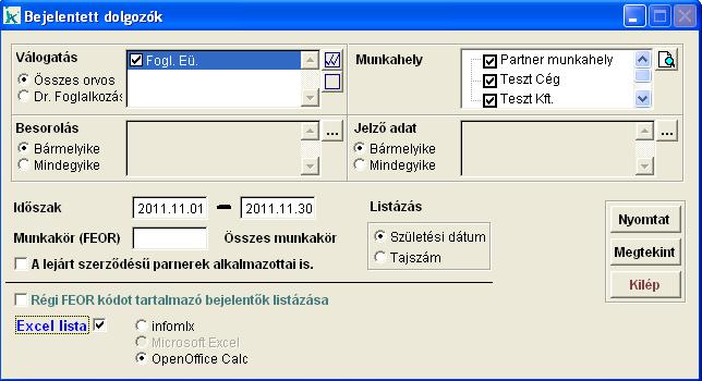 munkakör listázásra kerül. Választható, hogy a lejárt szerződésű partnerek alkalmazottai is szerepeljenek a listában. A 'Listázás' mezőben adjuk meg, hogy a paciens Születési dátuma vagy a TAJ száma kerüljön nyomtatásra. A lista kérhető azokról a bejelentett dolgozókról is, akiknek régi FEOR kód szerepel a bejelentőjükön.