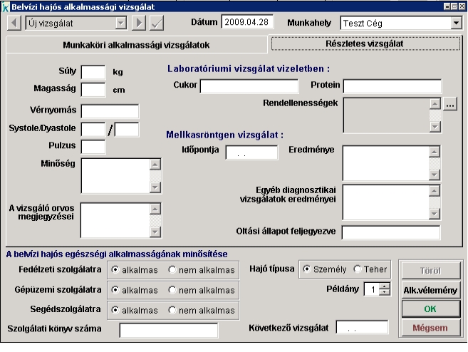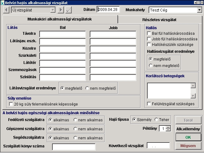 Értelemszerűen rögzítsük az eredményeket, majd alkalmassági véleményt (Orvosi igazolás, Hajós egészségügyi törzslap) az 'Alk.vélemény' gomb segítségével tudunk nyomtatni a megadott példányszámban. |