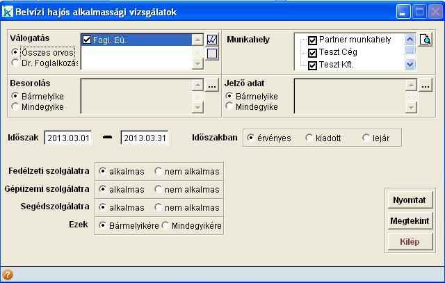 Ebben a menüpontban listát készíthetünk a kiadott belvizi hajós alkalmassági véleményekről a megadott feltételekkel.