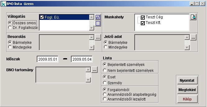 Ebben a menüpontban listát kapunk azokról a paciensekről, akik az adott időszakban a megadott BNO tartománynak megfelelő kódot kaptak az