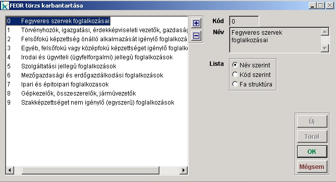 Ebben a menüpontban a FEOR törzs karbantartására nyílik lehetőség. Új FEOR elemet csak a legalsó szinten van lehetőség felvenni az 'Új' gombbal. Az általunk felvett FEOR elemet a 'Töröl' gombbal tudjuk eltávolítani a listából. Az 'OK' gombbal jóváhagyjuk az esetleges módosításokat és bezárjuk az ablakot. A 'Mégsem' gomb választása esetén a módosítások nem kerülnek mentésre és bezárja az ablakot. |