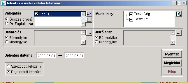 A 'Válogatás' mezőben tudjuk megadni, hogy a praxisban dolgozó összes orvosra, vagy csak az éppen bejelentkezett orvosra készítjük el a listát. A lista szűkíthető a 'Munkahely', 'Besorolás', 'Jelző adat' mezőkkel a többes választék segítségével. Megadható, hogy a 'Szerződött' vagy a 'Bejelentett létszámra' készüljön a jelentés.