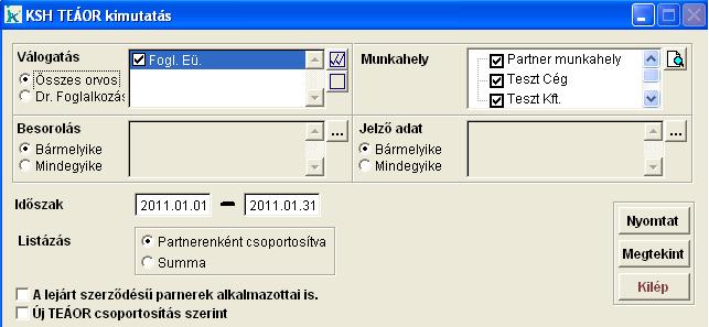 A 'Válogatás' mezőben tudjuk megadni, hogy a szervezetben dolgozó összes orvosra, vagy csak az éppen bejelentkezett orvosra készítjük el a listát. A lista szűkíthető a 'Munkahely', 'Besorolás', 'Jelző adat' mezőkkel a többes választék segítségével. A
