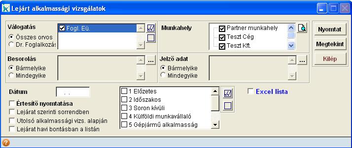 Ebben a menüpontban ki tudjuk listázni azokat a kiválasztott alkalmassági vizsgálatokat, amelyek a megadott időpontban lejártak.