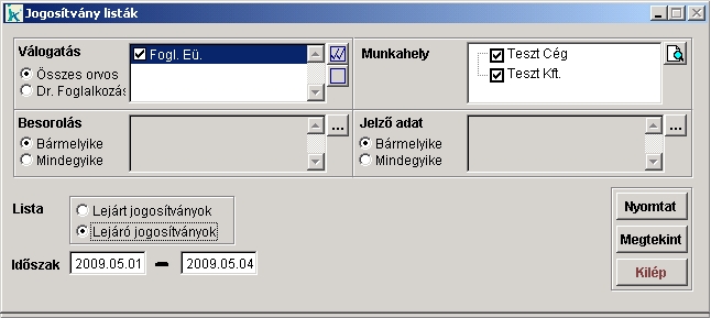 A lista segítségével kaphatunk információt a megadott időintervallumban lejárt vagy lejáró jogosítványokról.
