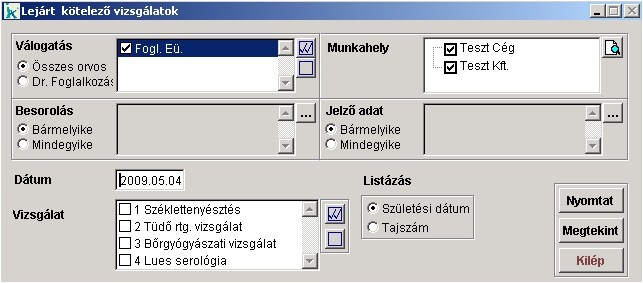 A megadott referenciadátum szerinti lejárt; és a 'Vizsgálat' mezőben kiválasztott vizsgálatokat vizsgálja a program. A referenciadátumot a 'Dátum' mezőben tudjzuk megadni. Jobb egérgombbal kattintva a dátum mezőre segítségünkre van egy naptár funkció. A vizsgálatok közül pedig a 'Vizsgálat' mezőben tudunk választani.