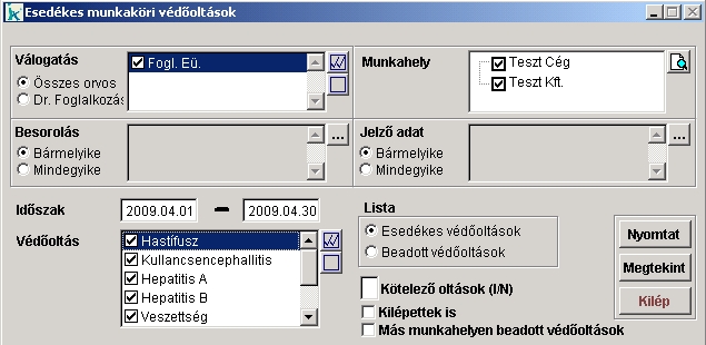 Lehetőségünk van csak a kötelező oltásokat kilistázni. Ilyenkor, ha ha csak ezeket szeretnénk látni a listában akkor egy "I", ha az összes oltást, akkor pedig egy "N" betűt írjunk a 'Kötelező oltások' mezőbe. Valamint választhatjuk, hogy a kilépett dolgozók, vagy a más munkahelyen beadott oltások is szerepeljenek a listában.