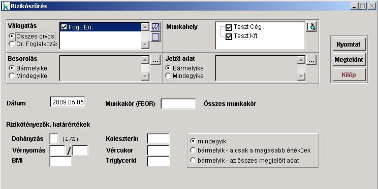 A 'Válogatás' mezőben tudjuk megadni, hogy a praxisban dolgozó összes orvosra, vagy csak az éppen bejelentkezett orvosra készítjük el a listát. A lista szűkíthető a 'Munkahely', 'Besorolás', 'Jelző adat' mezőkkel a többes választék segítségével.