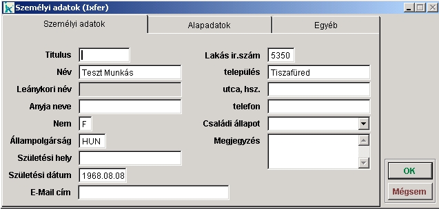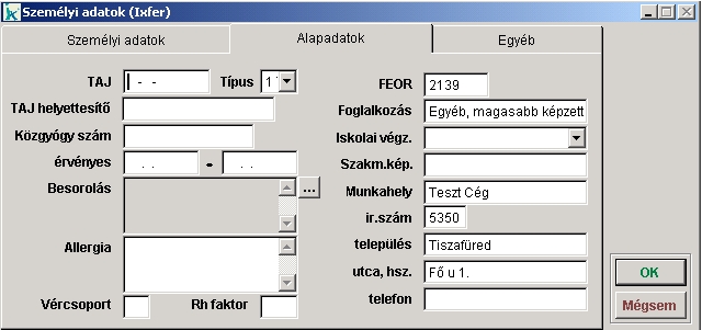 Ebben a menüpontban a paciens további adatait adhatjuk meg. Az 'OK' gombbal menthetjük az adatokat és bezárjuk az ablakot. A 'Mégsem' gombbal az adatok nem kerülnek tárolásra és bezárjuk az ablakot |
