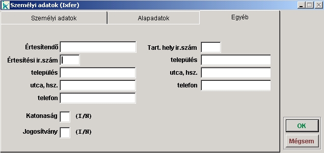 Ebben a menüpontban rögzíthetjük a Katonaságra, illetve a Jogosítványvra vonatkozó adatokat. Ehhez "I" (igen) vagy "N" (nem) betűket írjunk a ezen mezők elé. |