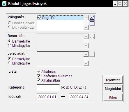 Az adott időszakban kiadott jogosítványokról készíthetünk listát ebben a menüpontban, az alkalmasság és a kategória szerint szűrve azt. |