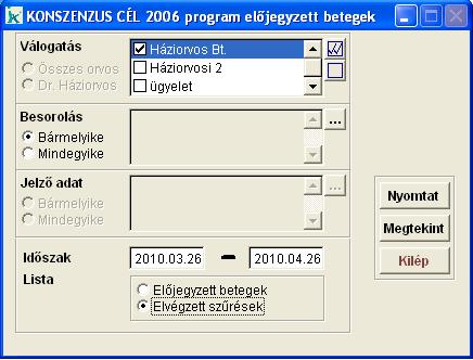 Ebben a menüpontban a KONSZENZUS CÉL 2006 programba felvett pacienseinket tudjuk kilistázni 'Elvégzett szűrések', illetve 'Előjegyzett betegek' feltételek szerint.