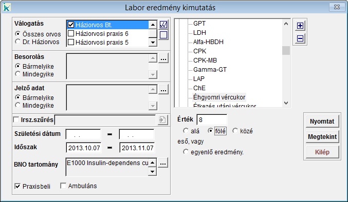 A válogatás mezőben megadható, hogy mely orvos(ok)ra és mely praxis(ok)ra kérjük a lista