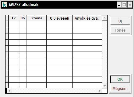 A nőgyógyászati mozgó szűrési szolgálat adatit rögzíthetjük itt. A táblázatba egy új sort ad kitöltésre a program az 'Új' nyomógomb megnyomására. Ekkor írhatunk adatokat a táblázat celláiba. A már rögzített sort ha szükséges lenne, a Törlés nyomógombbal lehet a táblázatból eltávolítani. |