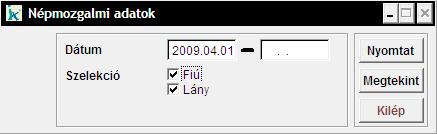 Ebben a menüpontban a népmozgalmi jelentést készíthetjük el a megadott időszakra. A 'Szelekció' mezőben megadható, hogy milyen nemű csecsemők kerüljenek a jelentésbe.