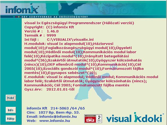 A névjegy ablakban a programról található meg néhány információ, mint a termék regisztrációs száma, a verzió szám, élesített modulok stb. Kilépni a jobb alsó sarokban látható Kilép nyomógombra kattintva lehet. |