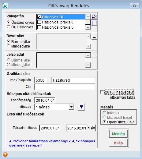Ebben a menüpontban a beoltandó pacienseinknek tudunk oltóanyag megrendelőt készíteni a 'Mentés' mezőben beállított filetípusba. A program automatikusan elkészíti a file-t a 'Mentés' gomb megnyomására a kválasztott program segítségével (Microsoft Excel, OpenOffice Calc, ezen programoknak előzetesen telepítve kell lenniük, csak akkor menthetők ilyen formátumokba a megrendelők). Mentéskor figyelnünk kell a file nevére! Erre a program fel is hívja a figyelmünket, az elkészített táblázat első munkalapján olvashatók a file elnevezésének szabályai. Az elkészült file-t csatolmányként küldjük tovább a megfelelő szerv felé. Először is adjuk meg a 'Válogatás' mezőben, hogy mely orvos pacienseinek kívánjuk elkészíteni a megrendelőt. Majd ezután ha készítettünk 'Besorolás'-t illetve 'Jelző adat'-ot a paciensekről annak érdekében, hogy csak a besorolásban, illetve a jelző adatban szereplő pacienseknek kívánunk oltóanyagot rendelni, akkor válasszuk ki a megfelelő besorolást és/vagy jelző adatot.