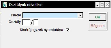 Ezzel a menüponttal lehet növelni a megadott iskola megadott osztályát. Például: ha kiválasztunk egy adott iskolát és megadjuk, hogy 1 A osztály, akkor az adott iskola 1 A osztályba járó összes gyermek 2 A osztályos lesz az OK gomb megnyomása után. Erről kísérőjegyzéket is lehet nyomtatni. A 'Mégsem' gombbal jóváhagyás nélkül zárhatjuk be az ablakot. |