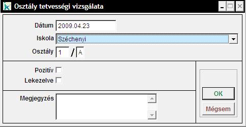 Ebben a menüpontban azt tudjuk rögzíteni, hogy a megadott iskola, megadott osztályában a tetvességi vizsglat pozití volt-e, illetve le lett-e kezelve.