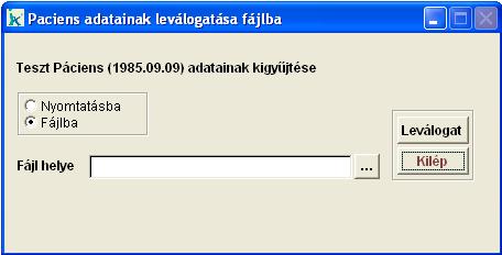 Ebben a menüpontban a kiválasztott beteg adatait az általunk megadott könyvtárba, a beteg neve és születésdátuma alapján képzett fájlba készíthetjük el. Ha vannak scanner felvételei, ezeket is az adott könyvtárba másolja. Scanner felvételek esetén az összegyűjtött adatok között, nem a megszokott 'multimédia' felirat látszik, hanem a kimásolt scanner felvétel neve. Ezzel a funkcióval egy kollégánknak egyszerűen átküldhetjük a betegünk adatait.