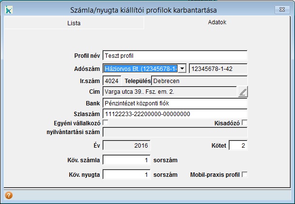 Az 'Adatok' fülön lehet kitölteni azokat az adatokat, amelyek majd az ezzel a profillal kiállított számlán, nyugtán a kiállító adatainál megjelennek. Ezen adatok - kiállító neve, címe, pénzintézet neve, számlaszám - kitöltése kötelező. A cím adatok nem írhatók át itt, azt a program a Praxis adatok karbantartása menüpontban megadott adatok alapján tölti ki. Ha a címen változtatni szeretnénk, akkor azt ott tehetjük meg, ehhez szükséges az infomIx Kft. segítsége, egy táveléréssel tudjuk módosítani a cím adatokat. Adószámot a rendszerbe felvett praxisoknál, szervezeti egységeknél megadott adószámokból lehet választani, ez az adat kézzel nem beírható, ezért csak olyan praxis számára hozható létre profil, amelynek adószáma ott ki van töltve. A profilhoz tartozó évszám nem módosítható adat, az a számítógép dátumának megfelelő évszámmal automatikusan feltöltődik. Megadható egy kötetszám, ez ad lehetőséget arra, hogy egy praxis több profilt - számlatömböt - tudjon használni. A rendszerben nem lehet ugyan arra az adószámra, ugyan arra az évre két ugyan olyan kötetszámú profilt létrehozni. Mivel a kiállított számla és nyugta sorszáma tartalmazza az év és kötet adatokat, ez biztosítja, hogy egy rendszerből ne lehessen két, azonos sorszámú számlát kiállítani. Megadható, hogy a létrehozott új profillal kiállított első számla, illetve nyugta milyen kezdő sorszámmal induljon, ez alapértelmezetten 1. Azok, akik rendelkeznek mobil praxis modullal, és a mobil oldalon is állítanak ki számlát vagy nyugtát, létre kell hogy hozzanak legalább egy külön profilt erre a célra. Mivel a mobil praxis lehetővé teszi, hogy egy időben egymástól fizikailag különálló rendszerben történjen a munkavégzés. Ehhez a profil létrehozásakor be kell jelölni a képernyő jobb alsó sarkában található Mobil-praxis profil opciót. A mobil praxisba Az azt használó szervezet mobil praxis számla profiljai kerülnek kitöltésre. Amennyiben egyéni vállalkozóként állítunk ki számlát, akkor töltsük ki az 'Egyéni vállalkozó nyilvántartási szám' mezőt, mert a 2009. évi CXV. törvény alapján a számlán szerepeltetni kell az "egyéni vállalkozó" megjelölést (vagy annak e.v. rövidítését) és nyilvántartási számát. A számla kiállításkor a profilhoz tartozó nyilvántartási számot betölti, és a kiadott számlán a megfelelő módon szerepelteti a program. Az adatokat a lista fülre visszalépve lehet tárolni az OK gomb megnyomásával. Ellenőrzésre kerül, hogy egy számla készítéséhez szükségs minden adat kitöltésre került-e, valamint az adószám-évszám-kötetszám adatok egyedisége, és csak ezek megfelelősége esetén tárolható a létrehozott profil. Ekkor egy kérdést tesz fel a program, mielőtt a tárolás ténylegesen megtörténik, mivel a profil adatai a tárolás után nem módosíthatóak. Dönthetünk úgy, hogy valóban tároljuk az adatokat - Igen válasz - , visszaléphetünk ellenőrizni az adatokat, vagy folytathatjuk azok megadását - mégsem válasz- , és kiléphetünk tárolás nélkül - nem válasz -. |