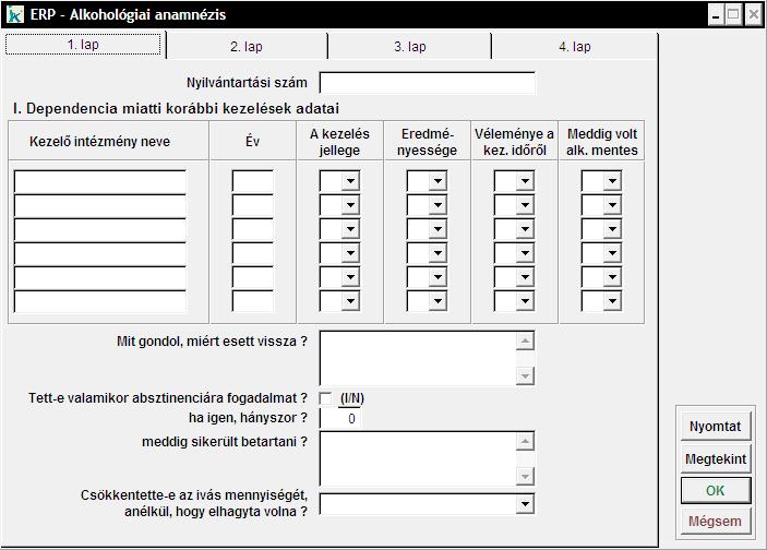 Az ablak 4 részből áll. Az első fülön a gondozott korábbi dependencia miatti kezelését dokumentálhatjuk, a második és harmadik fülön az alkoholfogyasztással kapcsolatos adatokat adhatjuk meg, míg a negyedik fülön gyógyszer és drog fogyasztással kapcsolatos adatokat rögzíthetünk.