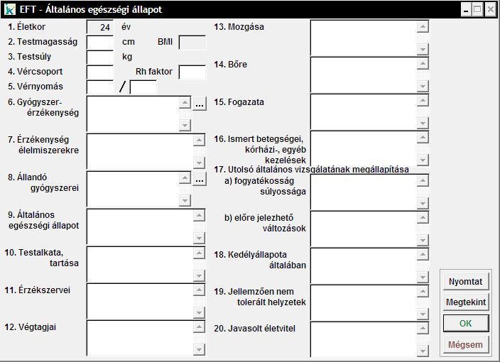 Az 'Életkor' mező automatikusan feltöltődik a Személyi adatok - törzskartonon megadott születési dátum szerint. A Gyógyszer érzéskenységeit és az Állandó gyógyszereit megadhatjuk a többes választék segítségével is. Az 'Ismert betegségei kórházi-, egyéb kezelések' mezőbe jobb egérgombbal kattintva segítségünkre van egy ATC csoport lista. Az 1-6-ig tartó és a 16-os mező kivételével az összes mező szabadszöveges, tehát karbantartható a szövegablakok szerint.