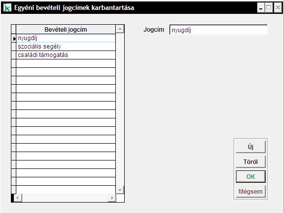 Az egyéni bevételi jogcímeket tarthatjuk karban ebben a menüpontban. Az 'Új' gomb megnyomásával tudunk új jogcímet felvenni a készletbe, melynek nevét a 'Jogcím' mezőben kell megadnunk. A töröl gomb segítségével tudunk már meglévő jogcímet törölni. Az 'OK' gombbal zárjuk be az ablakot az adatok tárolásához. |