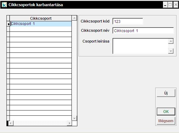 Ebben a menüpontban tudunk új Cikkcsoportokat létrehozni, meglévőket karbantartani. A Cikkcsoportokon belül pedig Cikktételeket tudunk létrehozni. Használjuk az 'Új' gombot az új Cikkcsoport létrehozására, valamint a megfelelőn állva módosíthatjuk is a már meglévőket. Az 'Ok' gommbal zárjuk be az ablakot az adatok tárolásához. |