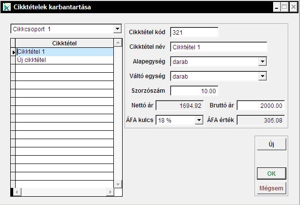 Nyomjuk meg az 'Új' gombot új Cikktétel létrehozásához, majd adjuk meg a hozzájuk tartozó adatokat. Valamint módosítani is tudjuk már meglévő Cikktételeink tulajdonságát, ha arra kattintunk, amelyet módosítani szeretnénk.