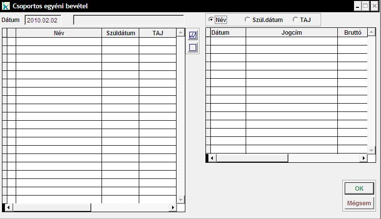 A kiválasztott gondozottak utolsó egyéni bevételei alapján átvezethetjük az aktuális dátumra a gondozott egyéni bevételeit. Ehhez válasszuk ki az átvezetni kívánt gondozottakat, majd nyomjuk meg az 'OK' gombot. Így nem kell a gondozottak Egyéni bevételekmenüpontját megnyitni egyenként, hanem (ha nem változtak az összeg(ek)) itt a kiválasztott gondozottak átvezetéseit egy gombnyomásra végrehajthatjuk. |
