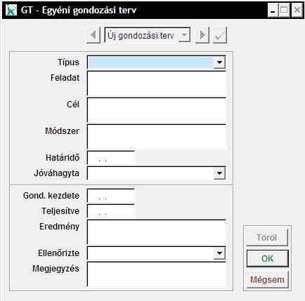 A szabadszöveges mezők pedig karbantarthatók a szövegablakok segítségével. A 'Töröl' gombbal tudunk már meglévő egyéni gondozási tervet törölni. Az 'OK' gombbal zárjuk be az ablakot az adatok tárolásához.