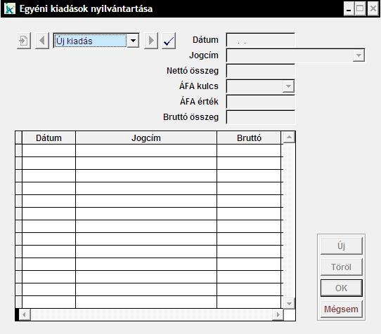 A 'Dátum' mező automatikusan a munkadátumnak megfelelően töltődik ki. A mezőn jobb egérgombbal kattintva egy naptár funkciót kapunk segítségül. A 'Jogcím' lenyíló mezőből válasszuk ki, hogy milyen jogcímen adjuk ki a pénzt és adjuk meg annak 'Nettó' összegét és az 'ÁFA kulcs'-ot. A program a kiválasztott kulcsnak megfelelően számolja ki a 'Bruttó' összeget. Az 'Új' gomb megnyomásával tudunk új kiadást rögzíteni, valamint a 'Töröl' gombbal már meglévőt törölhetünk. Az 'OK' gombbal zárjuk be az ablakot az adatok tárolásához.